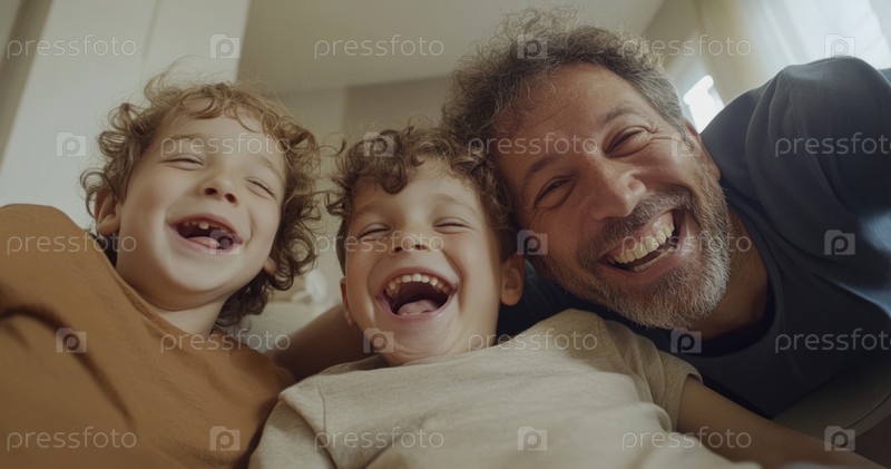 Отец радостно обнимает своих сыновей дома, лежащих на полу и обменивающихся смехом. Сгенерированное изображение