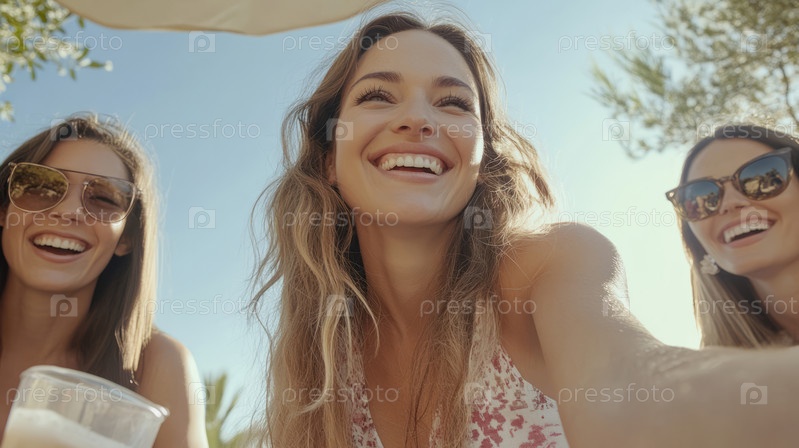 Счастливая женщина делает селфи с друзьями во время пикника на природе. Сгенерированное изображение