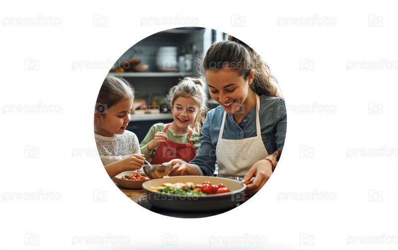 Дети наслаждаются готовкой и совместным обучением на веселом и интерактивном уроке кухни. Сгенерированное изображение