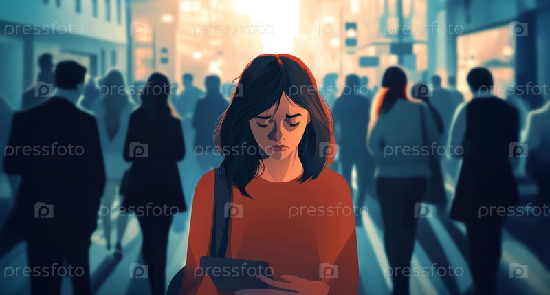 Женщина, испытывающая паническую атаку на оживленной городской улице, окруженная толпой, но при этом чувствующая себя изолированной и подавленной. Сгенерированное изображение