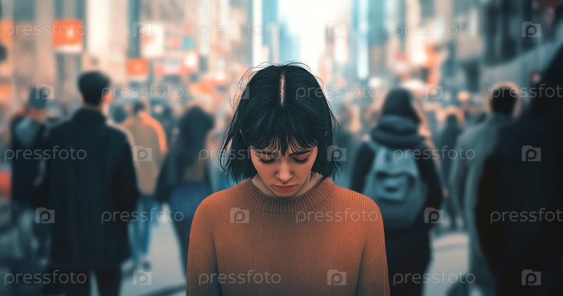 Женщина, испытывающая паническую атаку на оживленной городской улице, окруженная толпой, но при этом чувствующая себя изолированной и подавленной. Сгенерированное изображение