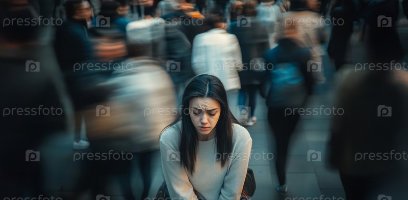 Женщина, испытывающая паническую атаку на оживленной городской улице, окруженная толпой, но при этом чувствующая себя изолированной и подавленной. Сгенерированное изображение
