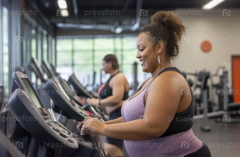 Женщина размера плюс тренируется с персональным тренером в современном спортзале. Сгенерированное изображение