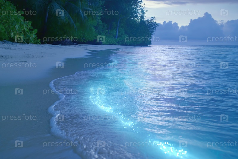 Mareel - свечение прибоя - на ночном океанском пляже, вызванное биолюминесценцией
