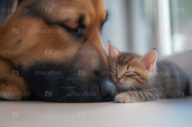 Собака и котенок спят вместе в помещении. Избирательный фокус