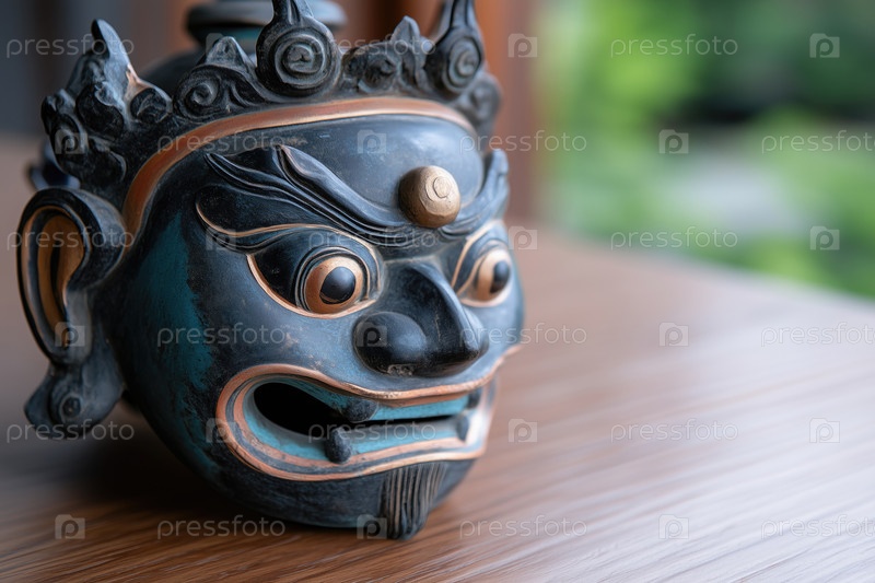 Традиционная восточная маска на деревянном столе, крупным планом. Избирательный фокус