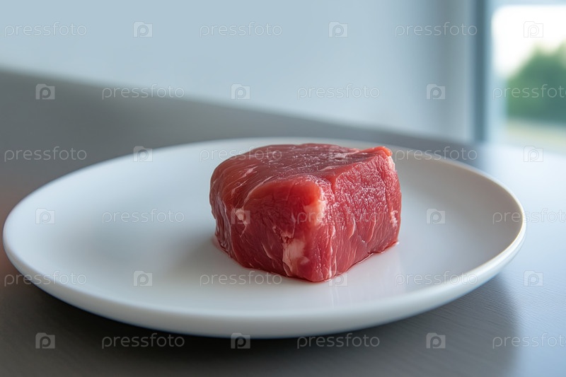Сырая говядина на белой тарелке. Малая глубина резкости