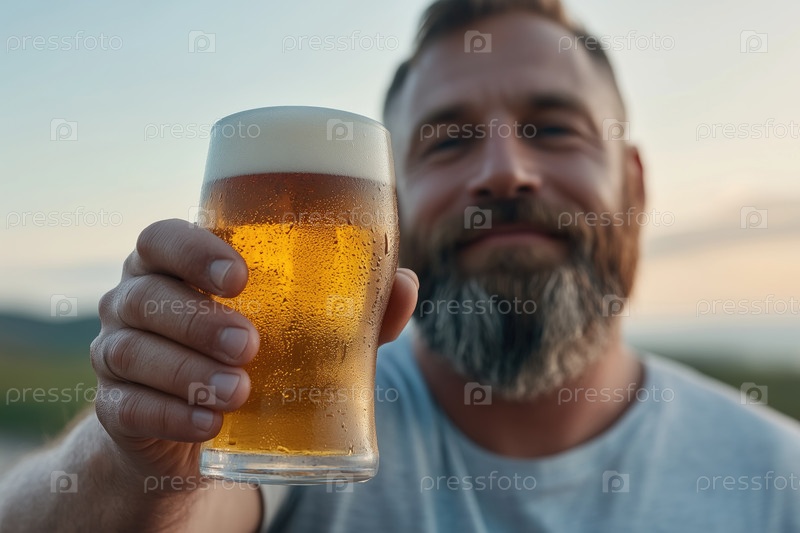 Крупный план бородатого мужчины, держащего стакан пива на открытом воздухе