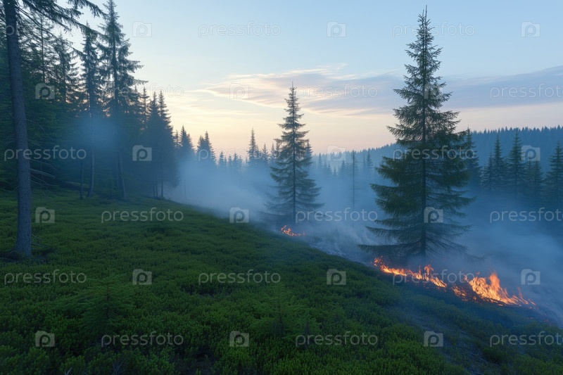 Поверхностный лесной пожар в сумерках в горном лесу