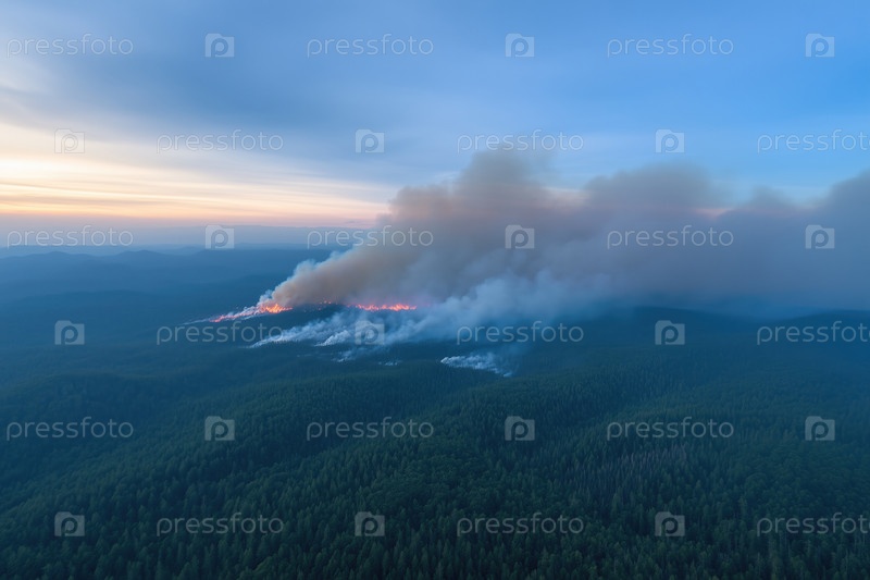 Вид с воздуха на лесной пожар в горах на рассвете