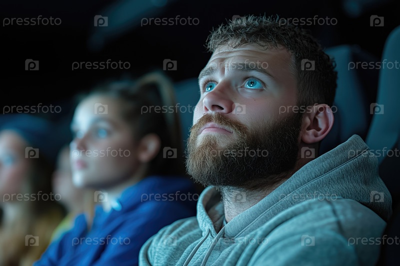 Группа людей смотрит фильм в кинотеатре. Фокус на сочувствующем человеке на переднем плане