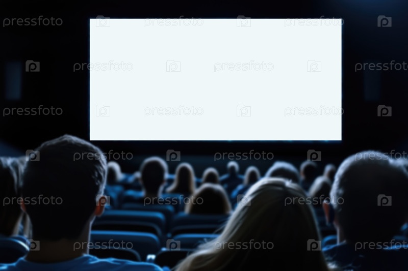 Люди смотрят фильм в кинозале, пустой белый экран с копировальным пространством