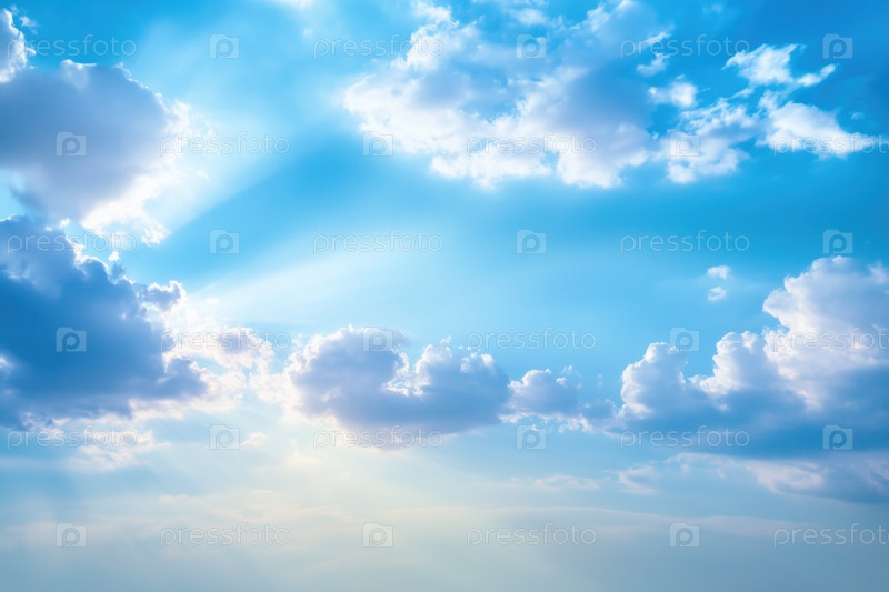 Голубое небо фон с красивыми облаками и солнечными лучами. Природа фон