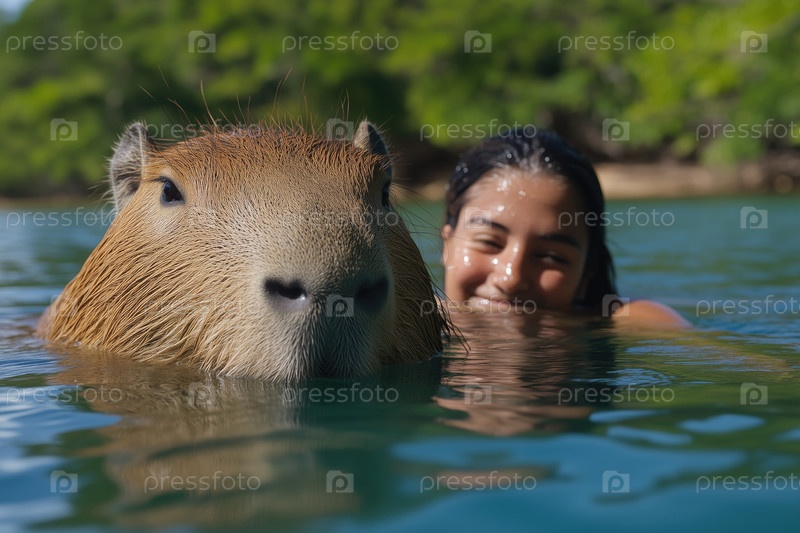 Женщина плавает с капибарой в воде в солнечный день на открытом воздухе