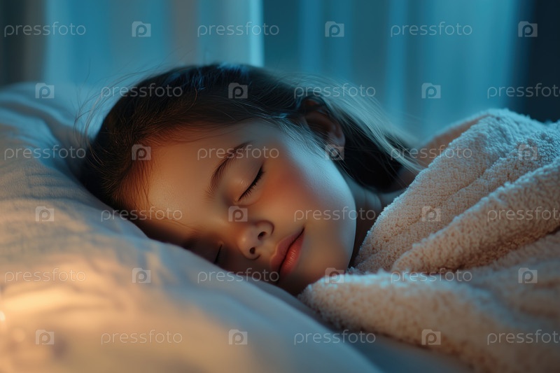 Маленькая девочка спит на кровати в спальне ночью при свете ночника