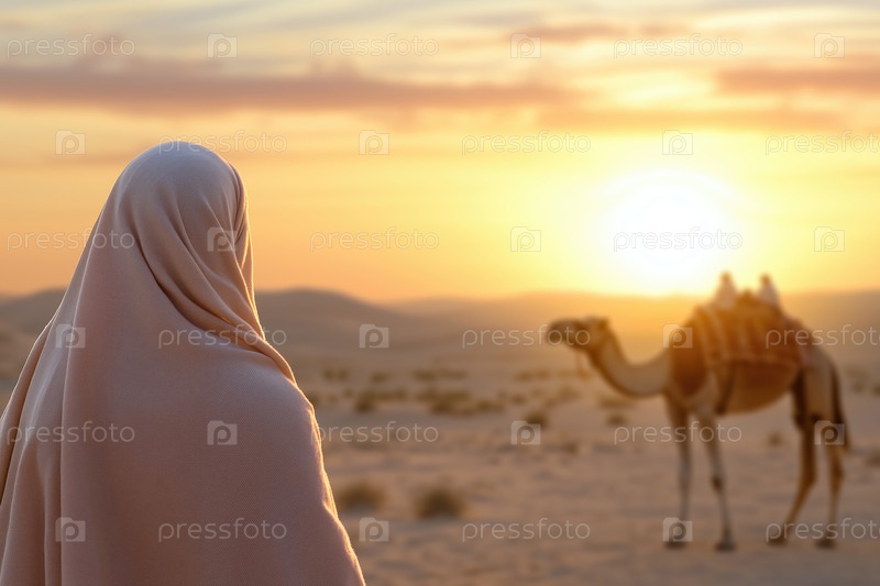 Ближневосточная женщина с верблюдом в пустыне на закате