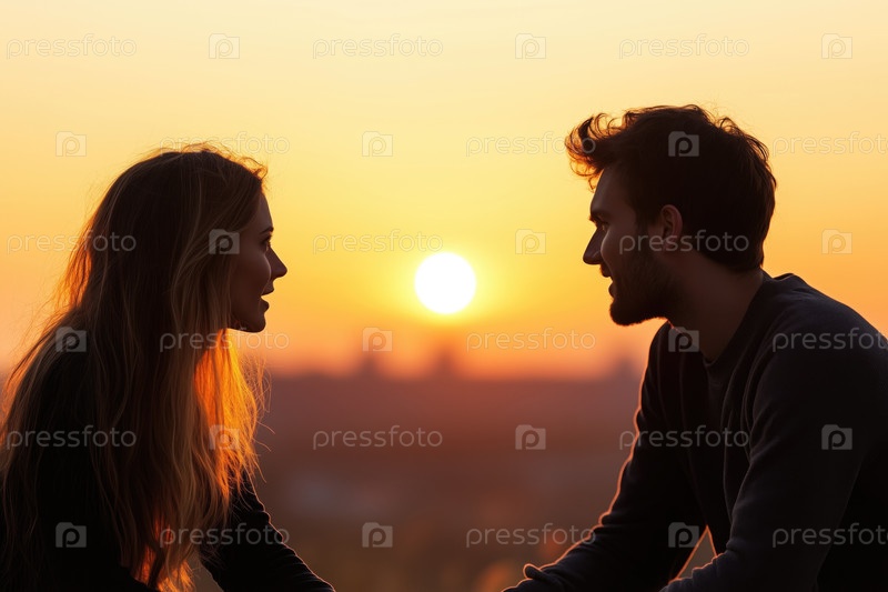 Портрет молодой пары, смотрящей друг на друга на закате на открытом воздухе