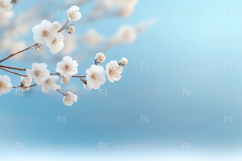 Белые цветы сакуры на синем фоне. Цветочный весенний фон с копией пространства