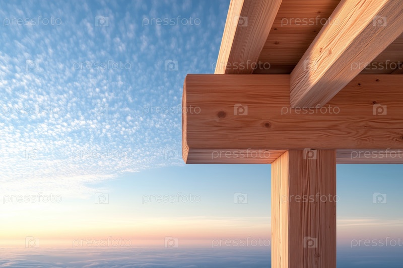 Деревянные балки на фоне голубого неба с облаками, концепция деревянного строительства