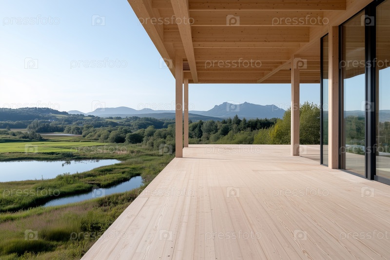 Терраса недавно построенной деревянной виллы в сельской местности, концепция деревянного строительства