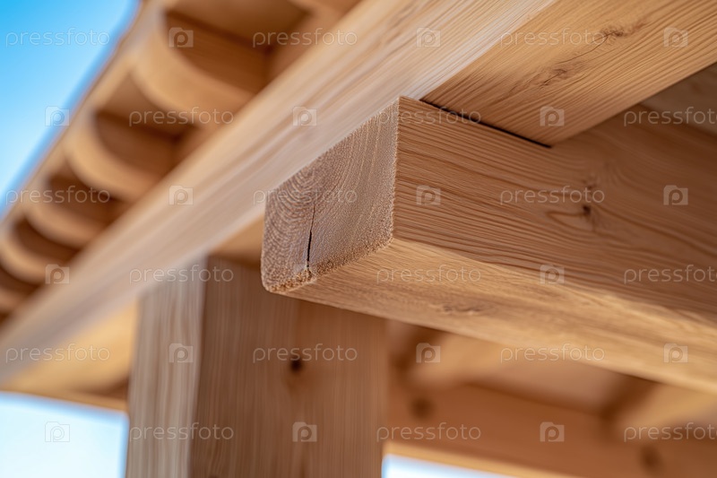 Деревянные балки на фоне голубого неба с облаками, концепция деревянного строительства