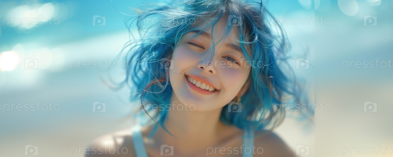 Молодая красивая женщина с синими волосами на размытом фоне летнего пляжа