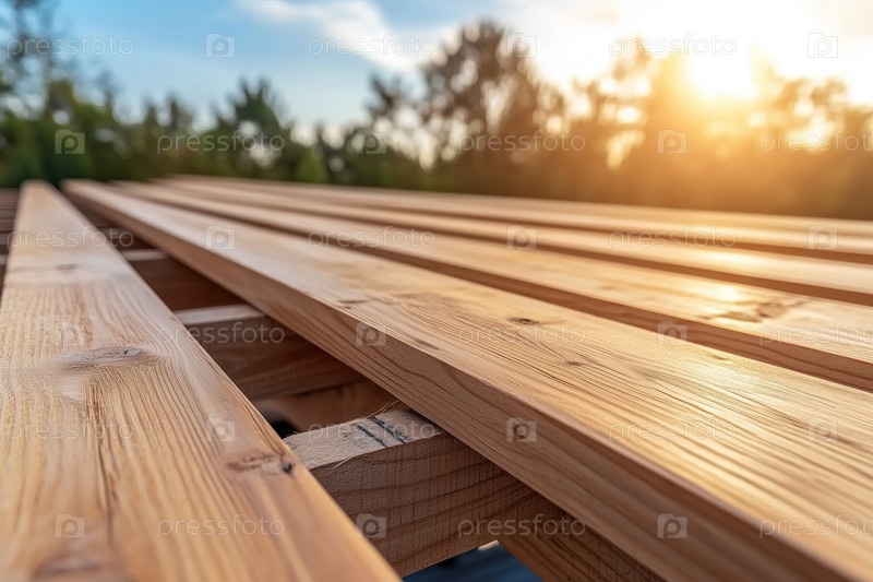 Деревянный пол нового дома, строительные доски на солнце крупным планом. концепция деревянного строительства
