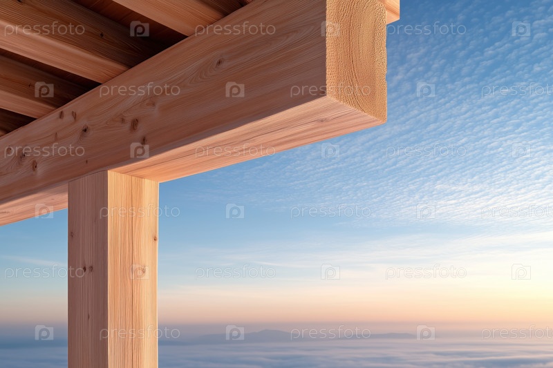 Деревянные балки на фоне голубого неба с облаками, концепция деревянного строительства