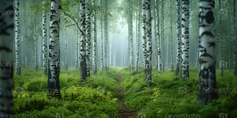 Тропа через красивый березовый лес туманным утром