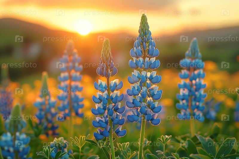 Цветы люпина цветут в поле на закате. Красивый фон природы