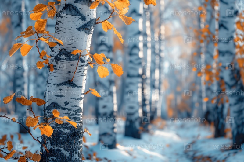 Березовый лес с осенней листвой под первым снегом