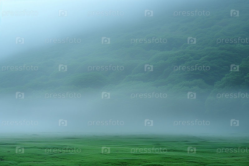 Туманный пейзаж с зеленым лугом и деревьями утром, минималистский природный фон