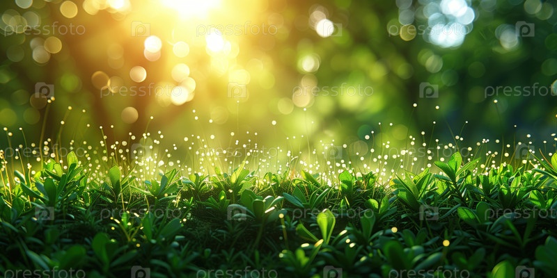 Зеленый фон травы с боке и солнечным светом. Фон природы