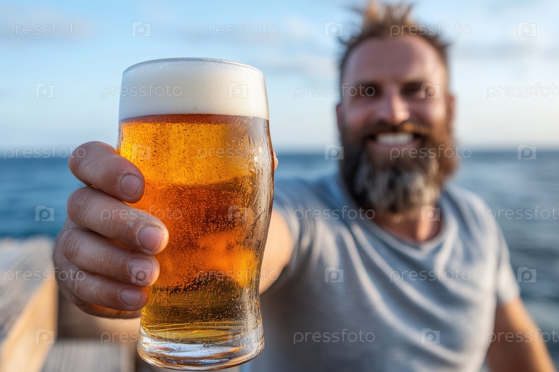 Портрет красивого бородатого мужчины, пьющего пиво на открытом воздухе