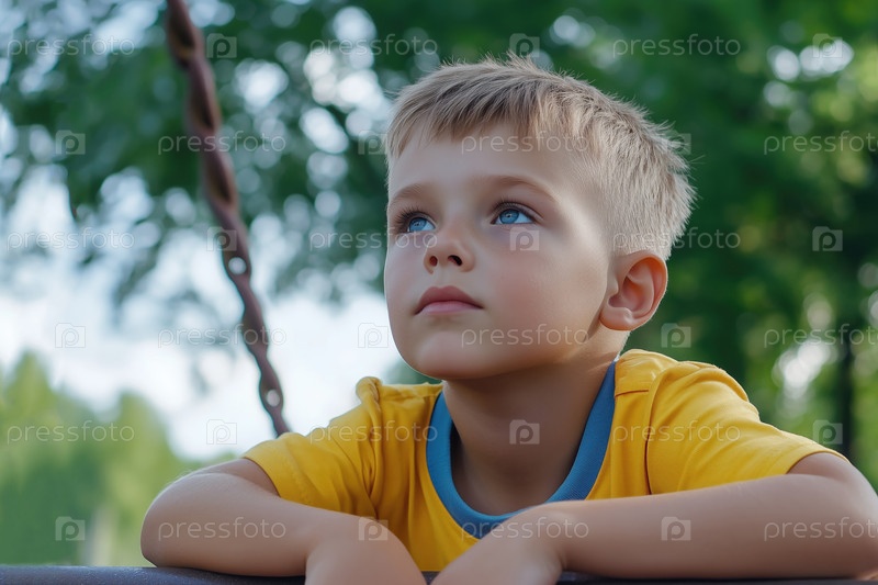 Маленький мальчик на детской площадке мечтательно смотрит вдаль