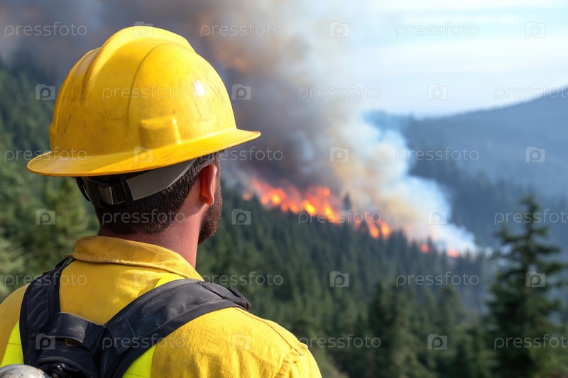 Пожарный готовится тушить лесной пожар в горах