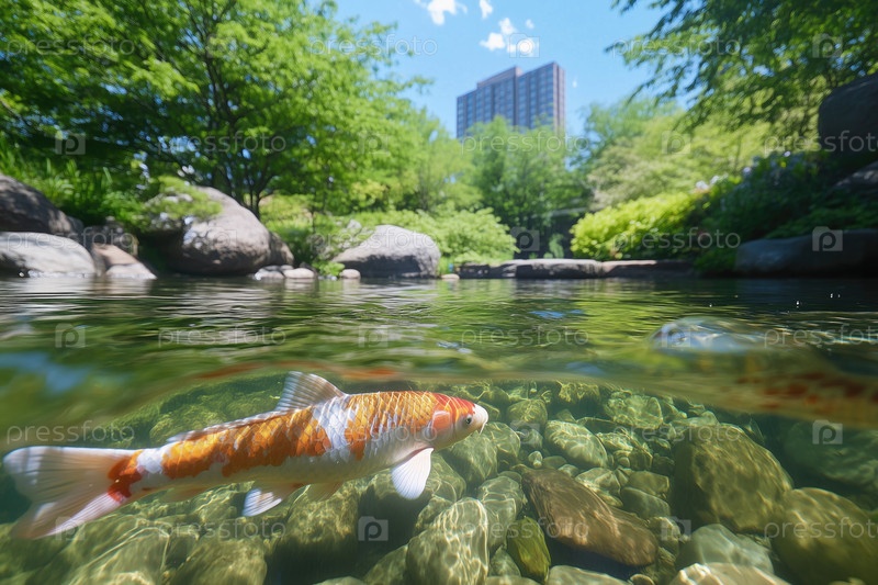 Японский карп кои плавает в саду в городе