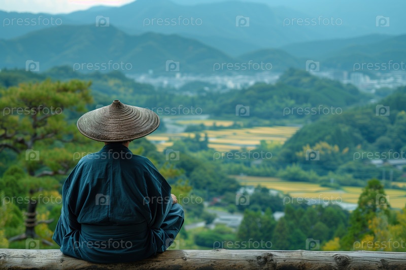 Азиатский крестьянин сидит на холме и смотрит в долину
