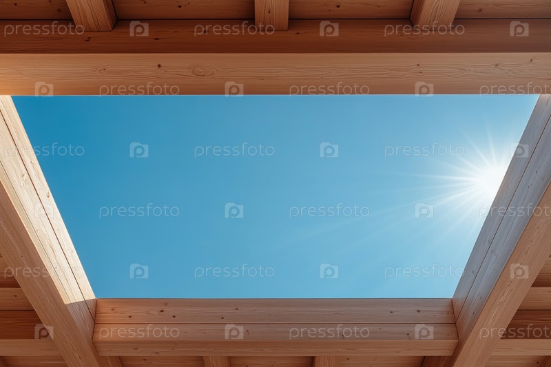 Окно в деревянной крыше с голубым небом и солнцем, концепция деревянной конструкции