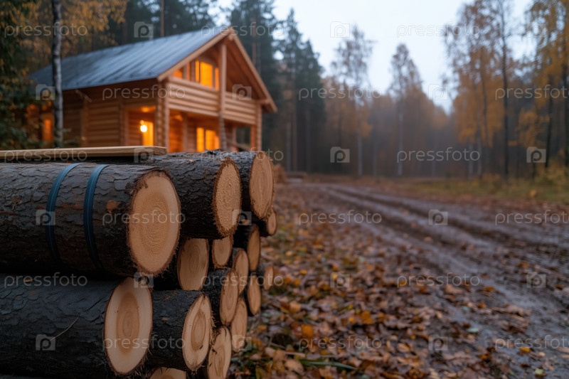 Недавно построенный деревянный дом в осеннем лесу, бревна на переднем плане, концепция деревянного строительства