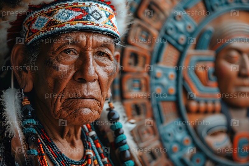 Портрет коренного американца в ритуальной одежде на фоне традиционного искусства