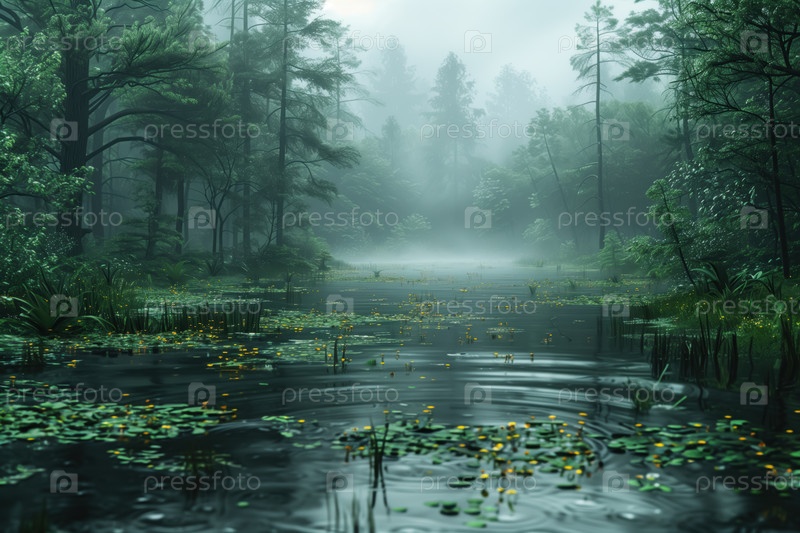 Туманное лесное озеро с кувшинками и водяными лилиями