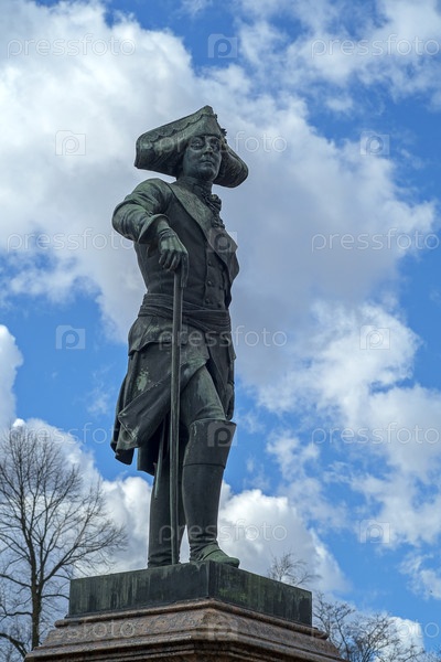 Гатчина (Россия, Санкт-Петербург). Памятник Павлу I перед Большим гатчинским дворцом а фоне голубого неба с облаками
