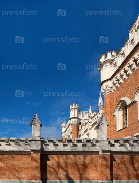 Россия, Санкт-Петербург, Петродворец, Императорские дворцовые конюшни, вид на фоне синего неба