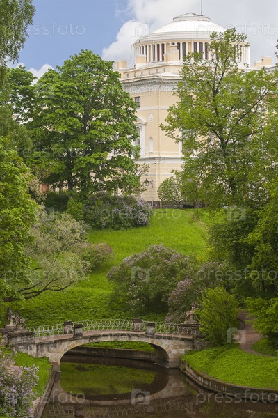 Дворец в Павловском парке и мост кентавров через реку Славянка летом