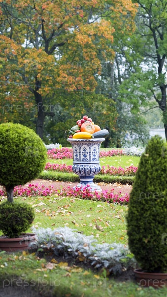 Осенний парк и глиняная китайская ваза с овощами