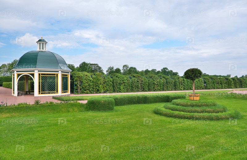 Петродворец (Петергоф, Санкт-Петербург, Россия). Летний вид Верхнего парка. Трельяжные беседки (берсо, перголы)