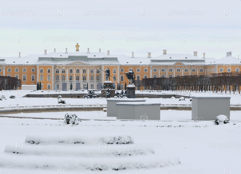 Петродворец (Петергоф, Санкт-Петербург, Россия). Зимний вид на Большой дворец и Дубовый фонтан из Верхнего парка