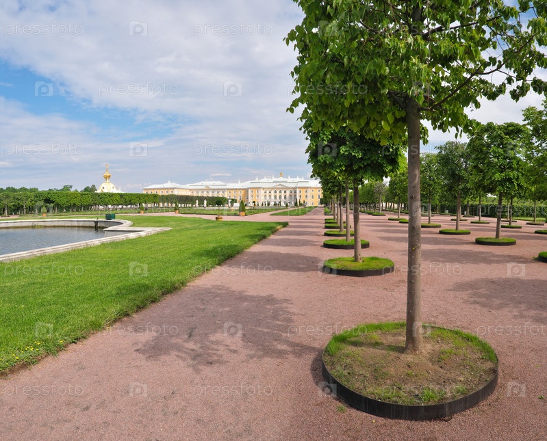 Петродворец (Петергоф, Санкт-Петербург, Россия). Летний вид на Большой дворец и фонтан Нептун из Верхнего парка