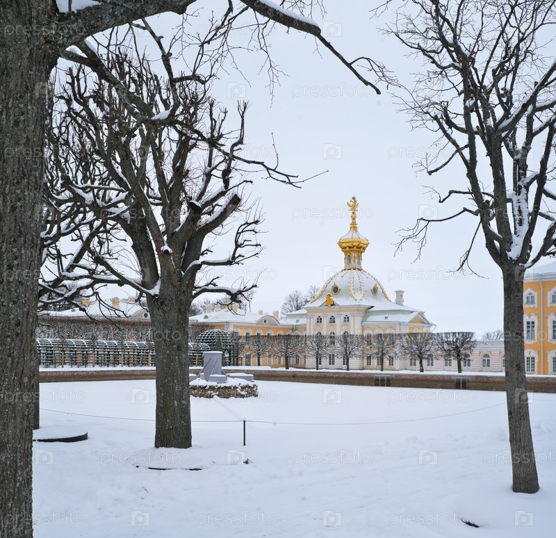 Петродворец (Петергоф, Санкт-Петербург, Россия). Зимний вид на Большой дворец и Церковный флигель из Верхнего парка